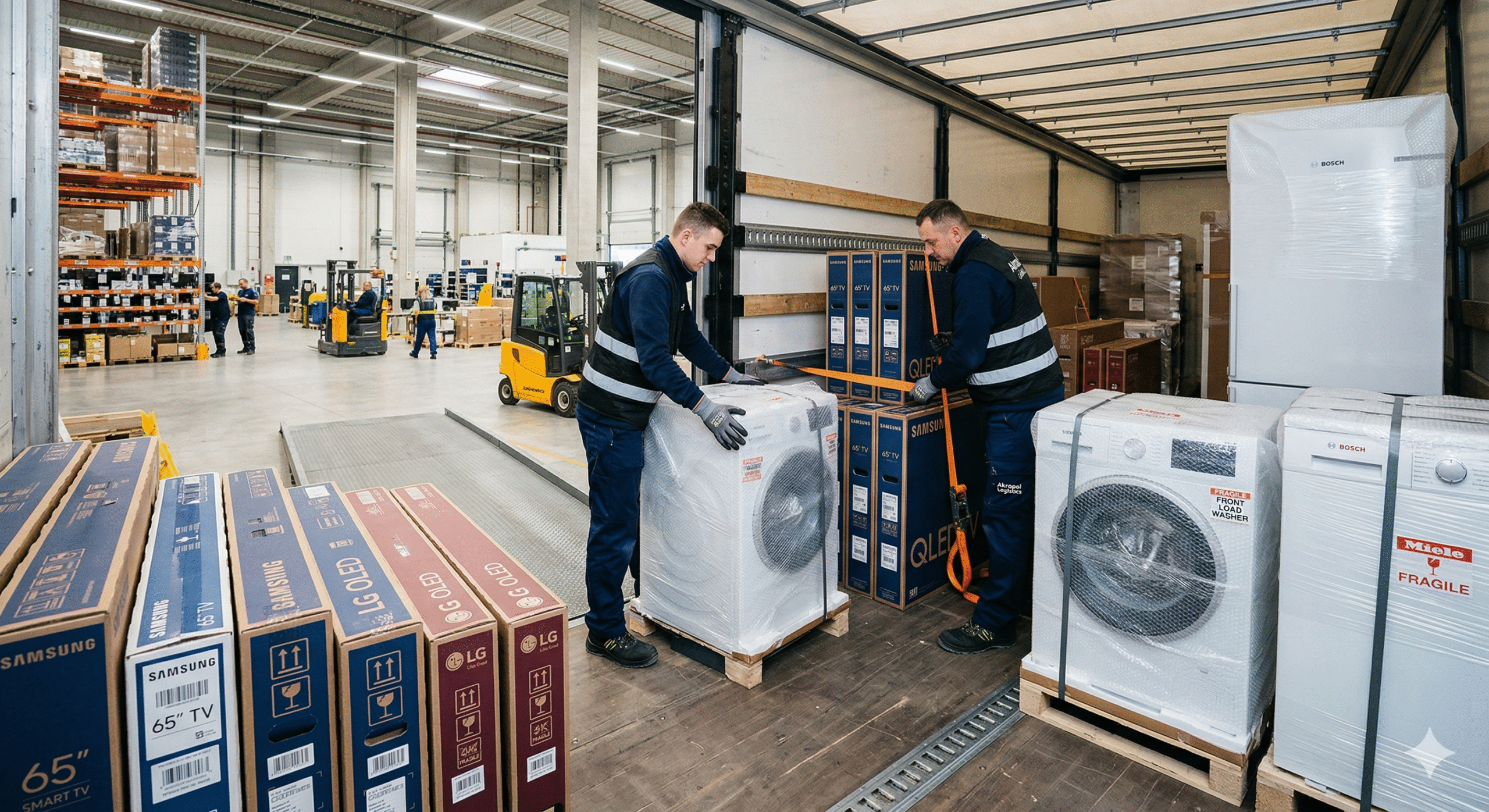 Fabryki w Polsce – LG Wrocław (telewizory, monitory), Electrolux Żarów (odkurzacze), Amica Wronki (AGD) eksportują do całej Europy, transport drogowy FTL bezpośrednio do centrów dystrybucyjnych klientów, wymogi just-in-time (okna czasowe +/- 30 minut).